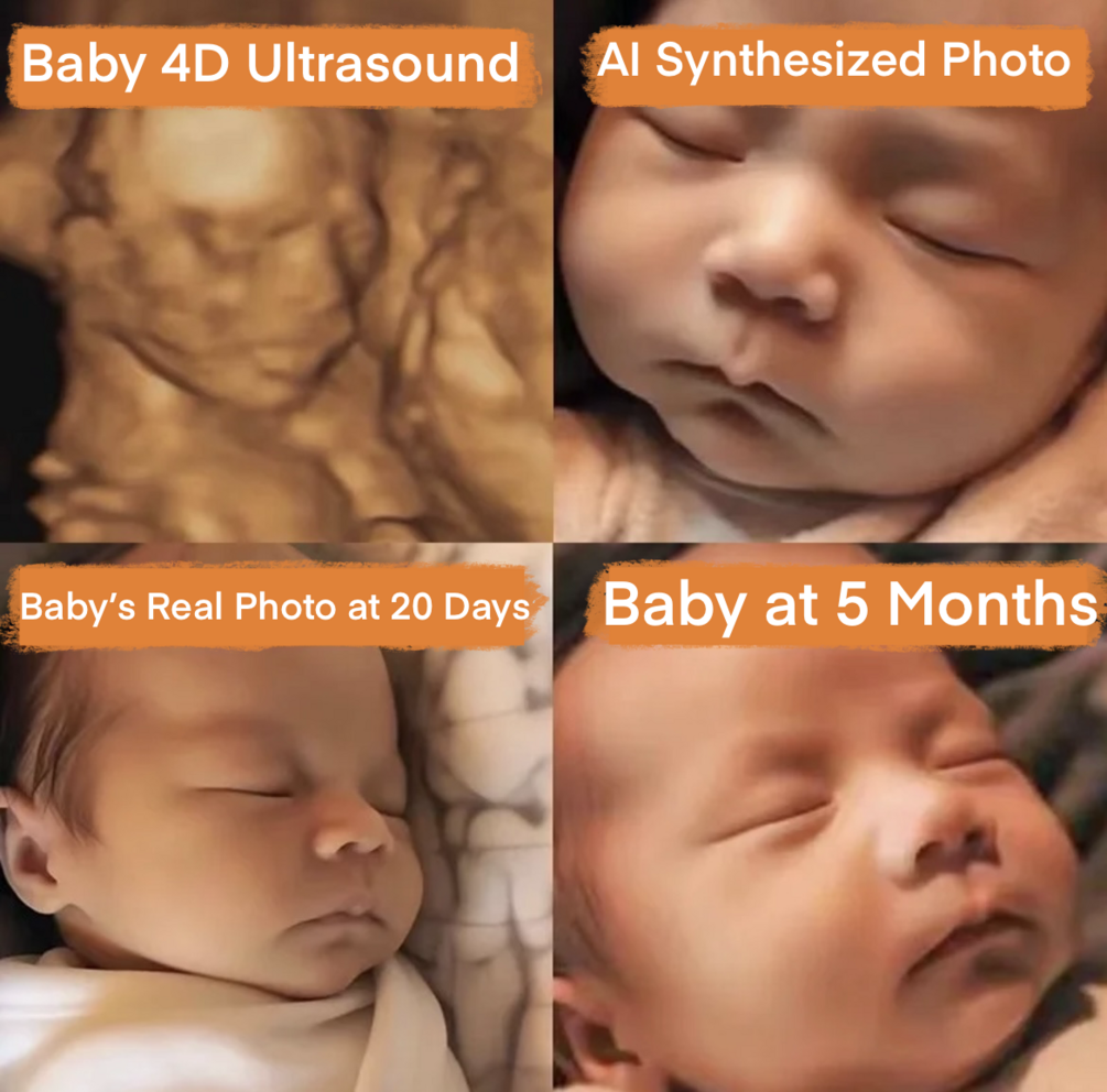 Discover the Baby AI Prediction! Our product combines advanced 4D ultrasound technology with cutting-edge AI image generation, allowing you to preview your baby’s appearance before birth. With clear images from 4D ultrasounds and AI-generated baby photos, you can see what your future baby might look like.